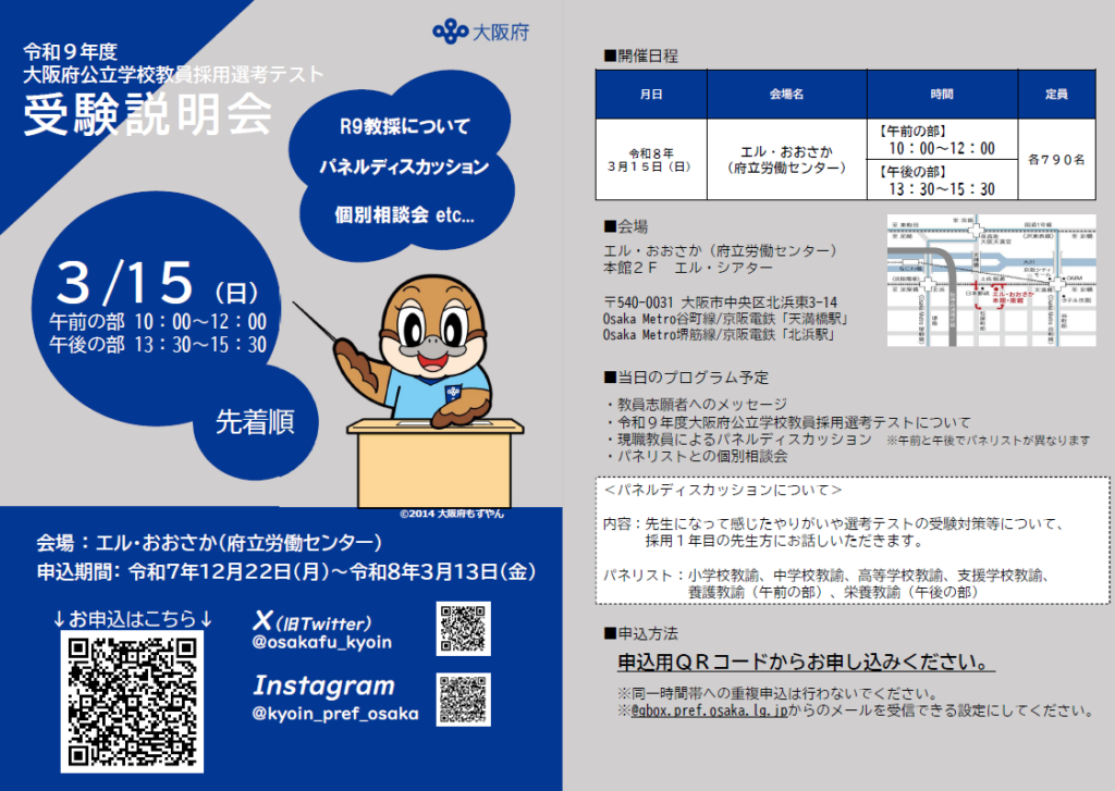 令和9年度大阪府公立学校教員採用選考テスト受験説明会の実施について 大阪府教育委員会では、教員採用選考テストの受験を考えている方を対象とした受験説明会を開催します。令和9年度教採の受験対象でない方も参加可能です。ぜひご参加ください。 開催日時 3月15日(日曜日)【午前の部】:10時00分~12時00分【午後の部】:13時30分~15時30分 会場 エル・おおさか(府立労働センター)本館2F エル・シアター 当日のスケジュール予定 ・教員志願者へのメッセージ・令和9年度大阪府公立学校教員採用選考テストについて・現職教員によるパネルディスカッション ※午前と午後でパネリストが異なります。 パネリスト:小学校教諭、中学校教諭、高等学校教諭、支援学校教諭、養護教諭(午前の部)、栄養教諭(午後の部)・パネリストとの個別相談会 申込方法 申込方法 申込みは電子申請で受け付けます。令和9年度大阪府公立学校教員採用選考テスト 受験説明会参加申込み(外部サイトへリンク) 申込期間 令和7年12月22日(月曜日)14時00分~令和8年3月13日(金曜日)17時00分まで その他 ※申込は先着順となります。定員に達し次第、申込受付を終了します。※同一時間帯への重複申込は行わないでください。※@gbox.pref.osaka.lg.jpからのメールを受信できる設定にしてください。